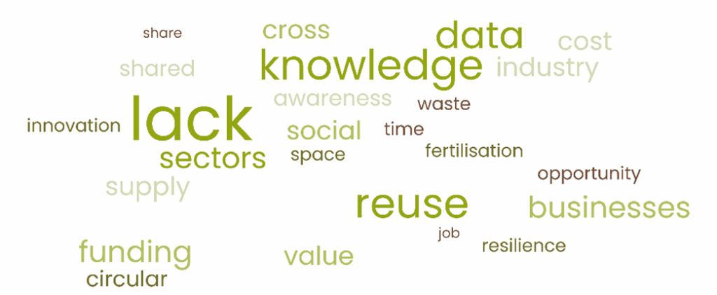 These conversations are critical for advancing circularity and enabling true industrial symbiosis, laying the collaborative foundations needed for lasting impact. Figure 1 highlights the most frequently discussed themes, with funding, collaboration, and innovation emerging as key priorities. Discussions also explored potential funding mechanisms to ensure the long-term sustainability of SEEH4C, reinforcing the Hub’s vision for a resilient, cross-sector network driving meaningful economic, environmental, and social change.