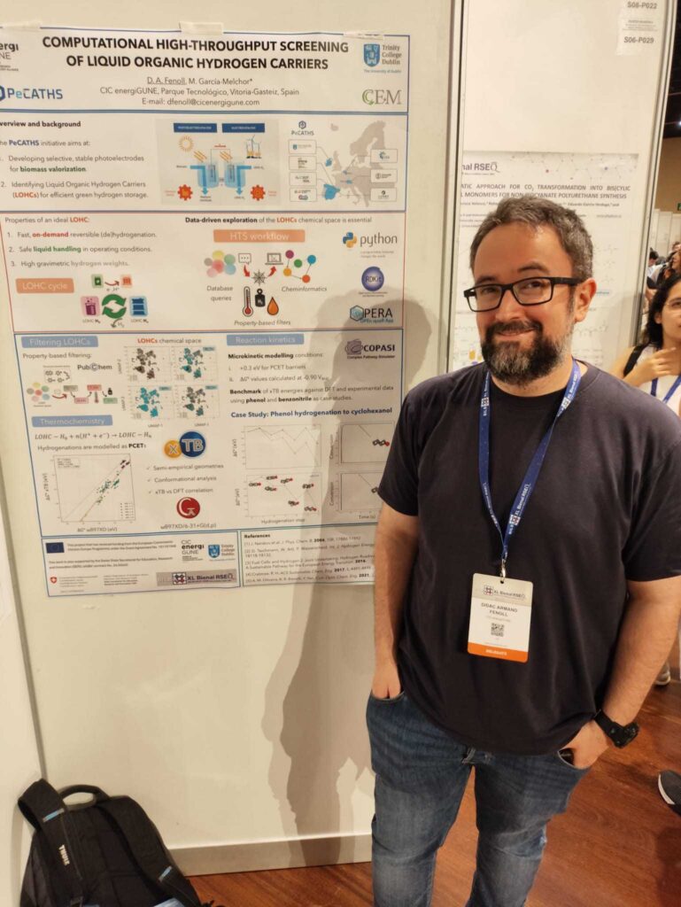 El Dr. Didac Armand Fenoll i el professor d’Ikerbasque, Dr. Max García-Melchor, del CIC energiGUNE (Parc Tecnològic, Vitòria-Gauzester, Espanya), van presentar dues contribucions relacionades amb la iniciativa PeCATHS. En primer lloc, es va presentar una comunicació oral titulada “Cribratge d’alt rendiment de LOHC per a l’emmagatzematge sostenible d’hidrogen” davant d’una àmplia audiència de prestigiosos investigadors nacionals i internacionals com a part del simposi de Química Verda. El treball presentat va incloure la discussió detallada de les etapes de filtratge de LOHC i els mètodes computacionals emprats en l’elucidació mecanística de la (des)hidrogenació reversible de LOHC. A la comunicació, es va presentar la plataforma de descobriment basada en dades per a LOHC, il·lustrant clarament la lògica subjacent al flux de treball computacional proposat mitjançant exemples seleccionats d’algoritmes de classificació de LOHC i simulacions termodinàmiques-cinètiques combinades. En segon lloc, es va exhibir un pòster titulat “Cribratge computacional d’alt rendiment de portadors d’hidrogen orgànics líquids” que contenia detalls addicionals sobre la iniciativa PeCATHS i la plataforma de descobriment de LOHC. Significativament, es van deixar ben clars els beneficis dels algoritmes d’aprenentatge automàtic per impulsar l’exploració de l’espai químic LOHC, així com la necessitat de descriptors d’activitat LOHC adequats.
