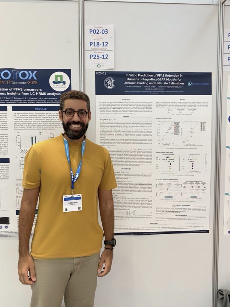 Periklis Tsiros, de la Universitat Tècnica Nacional d’Atenes, va presentar un pòster titulat “Predicció in silico de la retenció de PFAS en humans: integració de models QSAR per a la unió i l’estimació de la vida mitjana de l’albúmina“, que mostra nous enfocaments per a l’avaluació computacional de productes químics persistents. L’estudi introdueix una cadena de processos de relació quantitativa estructura-activitat (QSAR) de dos passos dissenyada per predir les afinitats d’unió a l’albúmina sèrica humana (HSA) i les vides mitjanes biològiques de les substàncies perfluoroalquilades i polifluoroalquilades (PFAS). El primer model aplica una regressió de Random Forest per estimar les constants d’associació (logKA) a partir de descriptors computacionals, mentre que el segon model utilitza un regressor de processos gaussià heteroscedàstic per capturar la variabilitat de la vida mitjana, integrant tant les característiques estructurals com les afinitats d’unió predites. Els models es despleguen a la plataforma Jaqpot, cosa que permet l’ús directe en línia per part de la comunitat científica sense experiència en codificació. Aquest treball avança els objectius del projecte SCENARIOS mitjançant el subministrament d’eines in silico per a l’avaluació de riscos de nova generació de les PFAS. En vincular les propietats moleculars amb els principals paràmetres toxicocinètics, l’enfocament proporciona informació valuosa sobre les relacions estructura-retenció i dóna suport a estratègies d’avaluació integrades per a productes químics altament persistents.