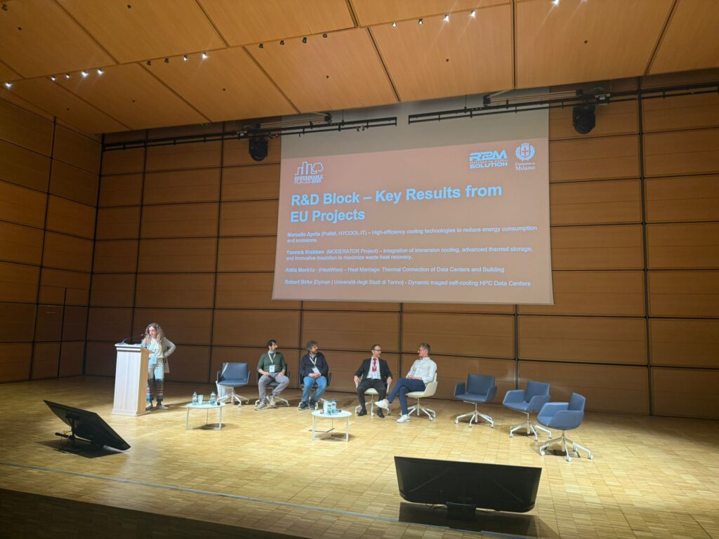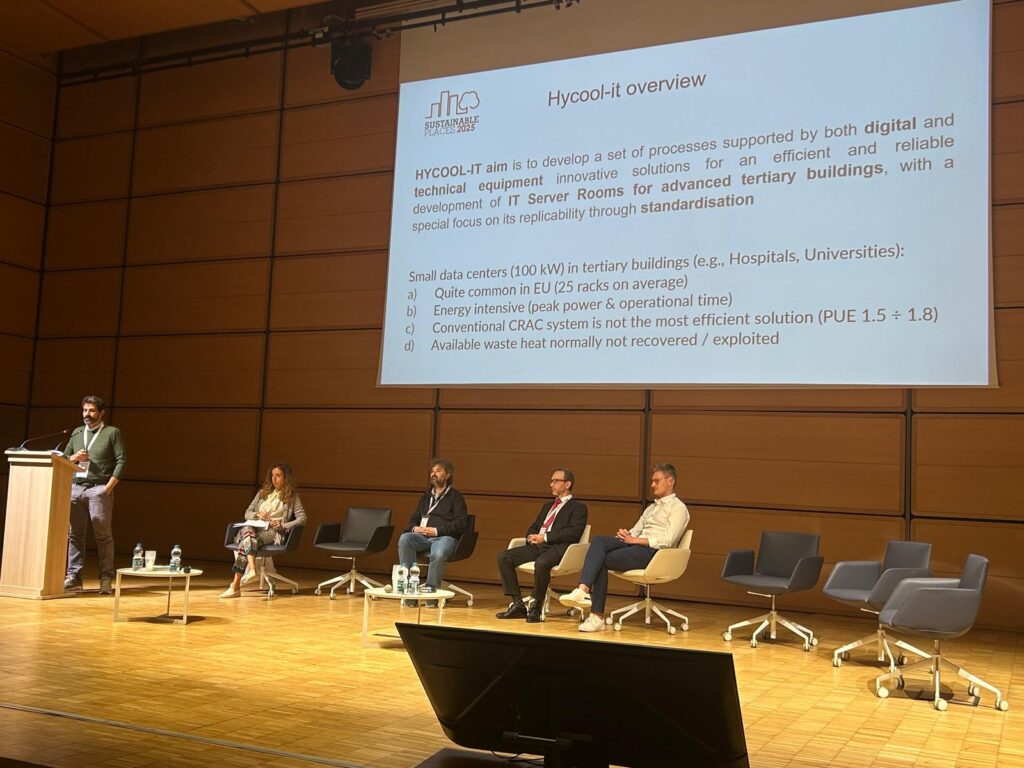 Durante la última edición de la conferencia Sustainable Places, celebrada en Milán en el Centro de Conferencias Monte Rosa 91 del 8 al 10 de octubre, nuestros colegas del Politécnico de Milán, Marcello Aprile y Rossano Scocia; Eduard Loscos de IDP; Fausto Sainz Salces de COMET; y Sander Smit y Fayaz Ahmed de R2M asistieron a la sesión en la que Marcello, coordinador del proyecto, presentó los avances de Hycool_IT en el proyecto piloto italiano dentro del ámbito de «Centros de Datos, Gemelos Digitales e IA para la Sostenibilidad». Esta sesión, coorganizada con la Red Italiana Proptech y con la participación de proyectos de investigación europeos y líderes del mercado, analizó cómo las nuevas tecnologías pueden mejorar la eficiencia energética, la resiliencia y el desempeño ambiental de las infraestructuras digitales, un ámbito cada vez más estratégico para la competitividad de Europa. Se trató de un foro estratégico que reunió a investigadores, proveedores de tecnología y actores clave del sector para explorar cómo los centros de datos, los gemelos digitales y la inteligencia artificial pueden acelerar la sostenibilidad en el entorno construido. Desde la optimización energética hasta la resiliencia urbana y la descarbonización, el evento ofrece una plataforma única para el intercambio de conocimientos, la colaboración intersectorial y la difusión de soluciones digitales en apoyo de la transición verde y digital.