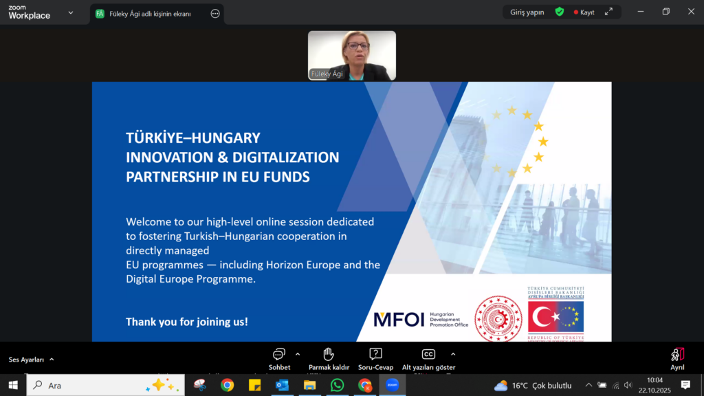 La reunión informativa en línea titulada “Asociación Turquía-Hungría en Innovación y Digitalización con Fondos de la UE”, organizada en cooperación con la Dirección de Asuntos Europeos del Ministerio de Asuntos Exteriores de la República de Turquía y la Oficina Húngara de Promoción del Desarrollo (MFOI), tuvo lugar el 22 de octubre.